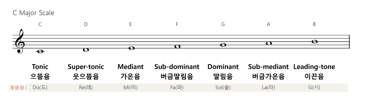 Tonic은 'Do(도)', Dominant는 'Sol(솔)'과 같이 위처럼 음계에서 각 음의 역할에 따라 이름을 붙여 부르는 것을 계명창이라고 한다. 음의 기능에 따라 붙여진 이름이기 때문에 각 조에 따라 계명에 붙는 실제 음들이 달라지게 되며, 이 계명창에 사용되는 이름을 '계이름'이라고 한다. 계이름은 고유한 '음이름'과는 다르게, 각 조(Key)에 따른 관계성을 가지는 이름이며, 악보를 읽을 때 음계에 따라 계이름으로 바꿔 부르는 것을 '이동 도법'이라고 한다. 예를 들어, F Major에서는 F음이 Tonic이므로 도가 되고, 그 완전 5도 위인 C음이 Dominant이므로 솔, Sub-dominant인 Bb이 파로 불리게 된다.