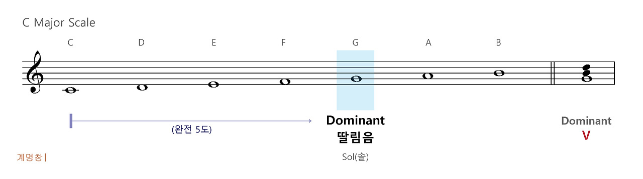 음계에서 5번째 음으로 Tonic과 '완전 5도' 관계이다. Tonic 다음으로 중요한 음으로써 'Dominant (지배적인)'의 의미를 가진다. 배음에서도 다뤘듯이 완전 5도의 음은 원음과 가까운 음이자 매우 밀접한 관계를 가지고 있다. 특히 조성 음악에서 Dominant는 조성을 확립하는 데 가장 중요한 역할을 하는 음으로, 완전 5도 관계의 중요성을 더욱 명확히 보여준다. Dominant는 Tonic을 가장 완벽하게 보좌하는 음이다.