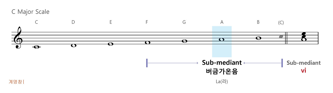 Sub-dominant는 Dominant 다음으로 Tonic과 가까운 음으로 여겨지며, Tonic을 Dominant보다 한 단계 아래의 보좌하는 역할을 한다.(I-IV-V-I)