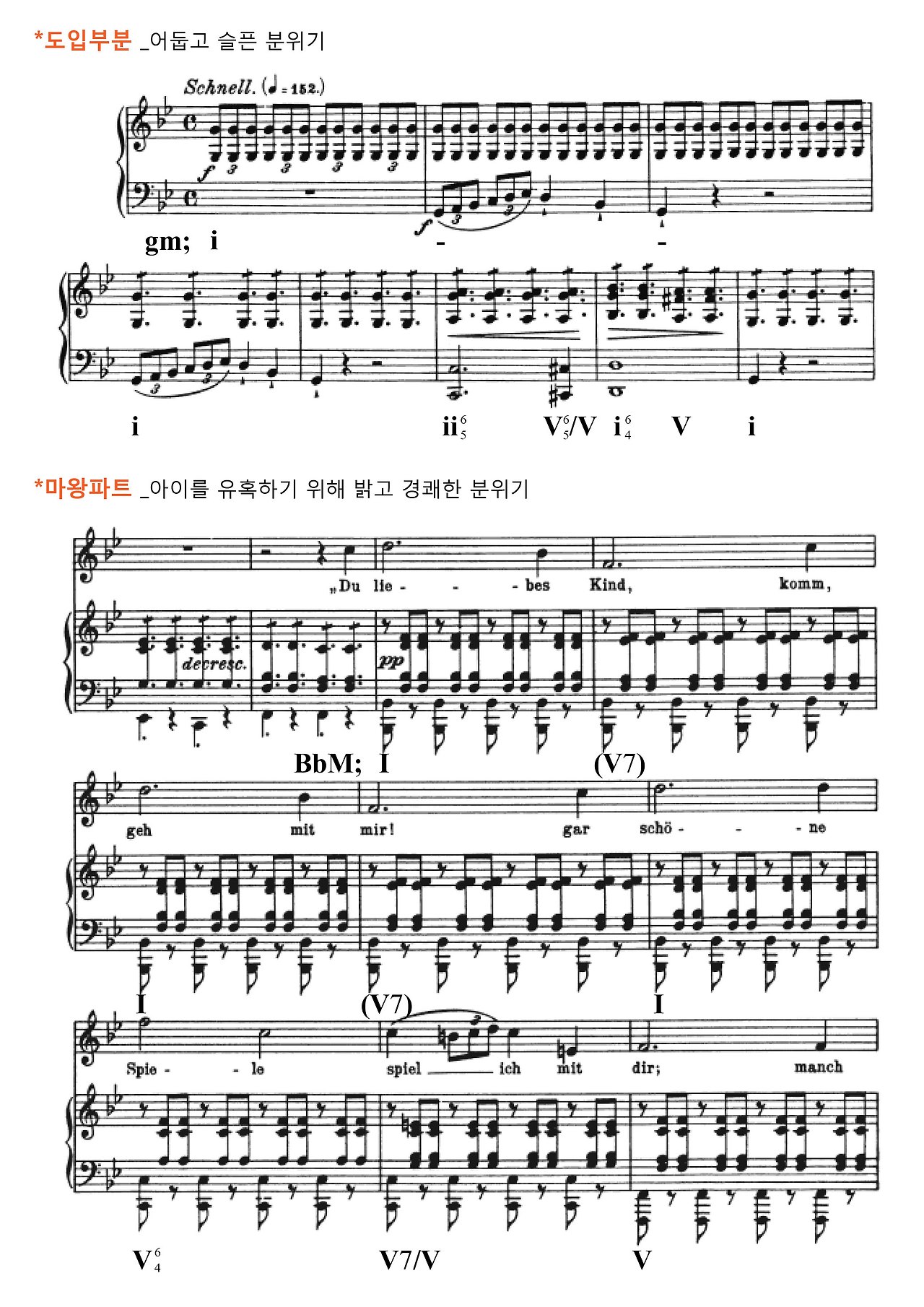 곡 전체의 화성적인 흐름은 단조(Minor)를 바탕으로 곡의 어둡고 긴장된 분위기를 표현한다. 그런데 마왕 부분에 가면 조성이 장조(Major)로 바뀌며 화성의 흐름이 달라지게 되는데, 밝고 경쾌한 분위기로 전환됨으로써 아이를 데려가고자 유혹하는 마왕의 달콤한 목소리를 뒷받침한다.