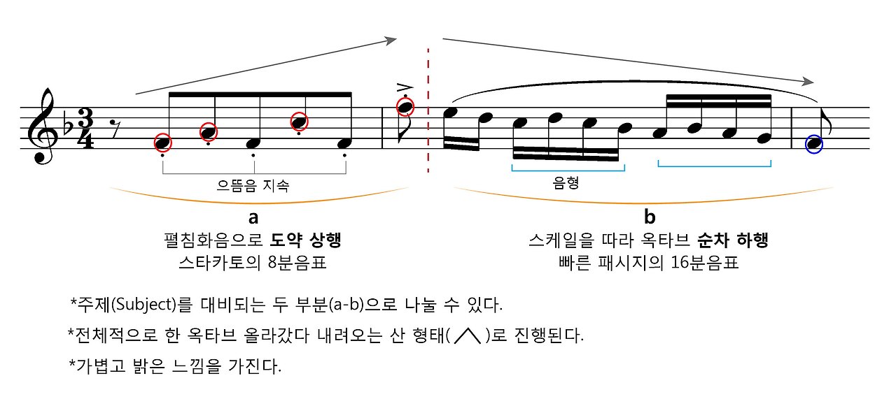 다성음악에서 주제(subject)는 곡 전체를 특징짓는 핵심 아이디어로 이 주제의 음형들을 다양하게 응용하여 곡 전체를 전개하고 있다. 곳곳에 변형된 주제 선율들이 각 성부에서 서로 주고받으며 나타나는 것을 들어볼 수 있다.