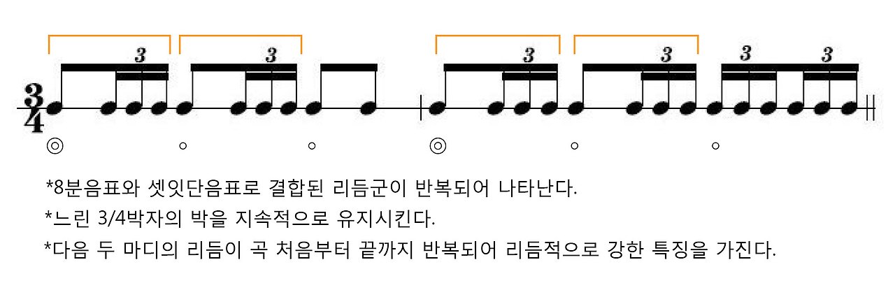 한 번쯤은 들어봤을 법한 친숙한 음악, 모리스 라벨의 볼레로는 1928년에 작곡된 발레곡으로 스네어 드럼으로 시작되는 리듬이 곡 처음부터 끝까지 반복되어 리듬에 있어 매우 특징적인 곡이다. 볼레로 리듬의 특징은 다음과 같다.