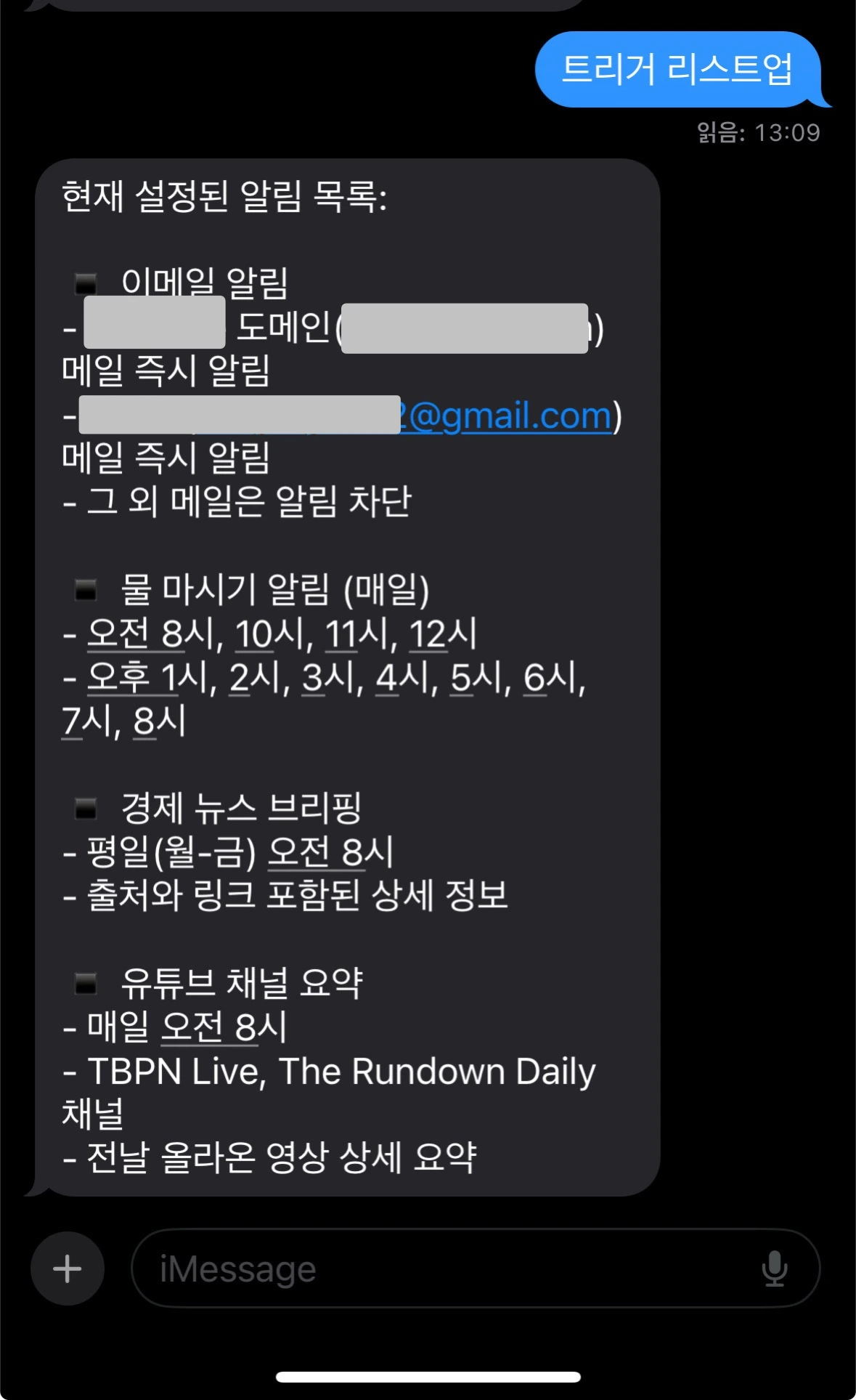 그뿐만 아니라 나만의 루틴도 단 5분 만에 채팅으로 구축했다. 구독 중인 해외 채널의 소식, 경제 신문, 그리고 '물 8컵 마시기' 같은 소소한 습관까지. 이 모든 과정에 GUI(Graphic User Interface)는 필요 없었다. 그저 대화했을 뿐이다.