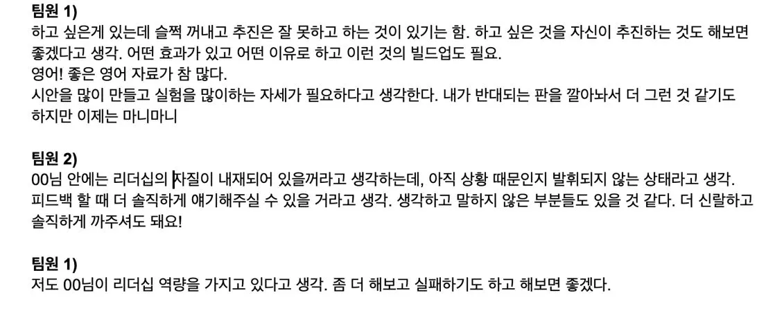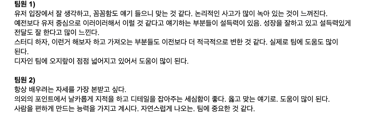 주니어 디자이너로 성장하는 과정에서 함께 일하는 동료들에게 받는 피드백 한마디 한마디가 언제나 저에겐 너무 소중한 것 같아요. 그렇지만 워낙 빠르게 돌아가는 회사 특성상 각자의 업무가 바쁘다보니 제가 피드백을 요청하는 것도, 피드백을 해주는 것도 모두 신경쓰지 못할 때가 있었어요. 이렇게 본격적으로 시간을 내어 서로에게 피드백을 주고 받는 시간을 가지고보니 여전히 한 팀원으로써 존중받고, 함께하는 기분이 들어서 너무 좋았습니다! 우리 디자인 팀이였구나! 하는걸 다시 몸소 느끼게 해주는 시간이였달까요.