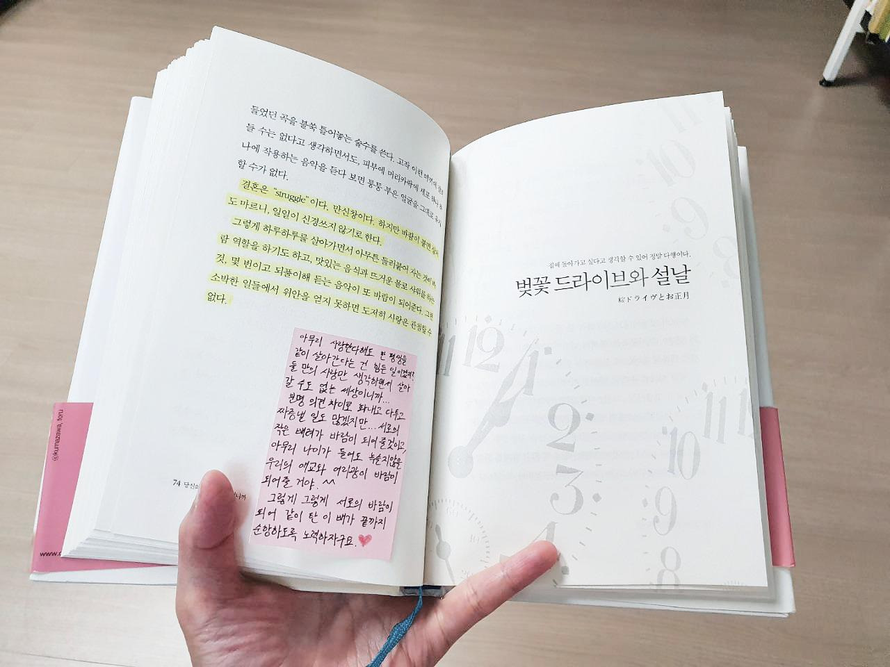 연애한지 천일이 되던 날이었다. 친구들을 만나기 위해 영등포행 기차에 오르는 나를 배웅하며 남편이 심심할 때 기차에서 읽으라고 손에 책 한 권을 쥐어주었다. 내가 좋아하는 작가인 '에쿠니 가오리'가 쓴 에세이집이었다. 기차에서 한 장 한 장 책을 넘기는데, 책 여기저기에 형광펜이 그어져 있는 걸 발견했다. 그리고 챕터가 끝나는 부분마다 포스트잇이 붙어있었는데, 거기엔 남편이 느낀 간단한 감상이 적혀있었다. 절반을 채 읽지 못하고 목적지에 도착해서 친구들을 만났다. 그 때 만난 친구는 내 손에 들린 책을 떠들어 보고는 감동을 받았는지 눈물을 그렁거렸다.