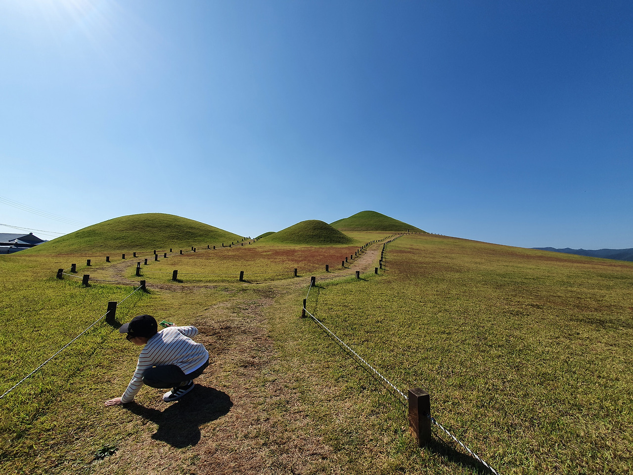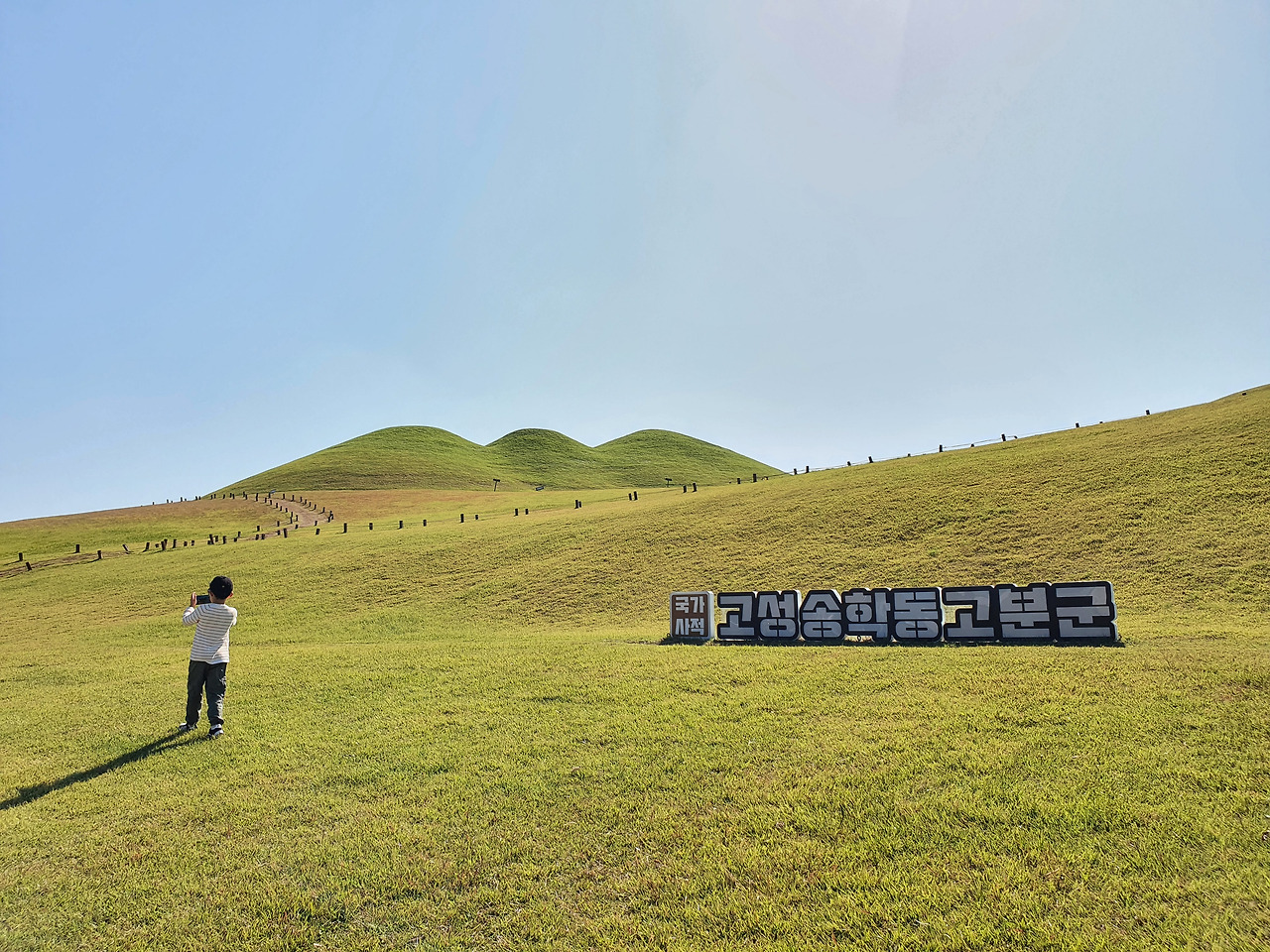 제일 먼저 들른 곳은 '고성송학동고분군'이에요. 고성군 시가지 인근에 있습니다. 접근성이 좋아요. 사진으로만 봐선 잘 모르지만 주변이 다 도로와 건물인데 그 중간에 고분군의 잔디가 쫙 펼쳐져 있습니다. 주변 풍경과 어울리지 않는다는 생각이 들면서도, 그만큼 보존을 위해 힘썼다는 걸 말해주는 반증 같기도 했어요.