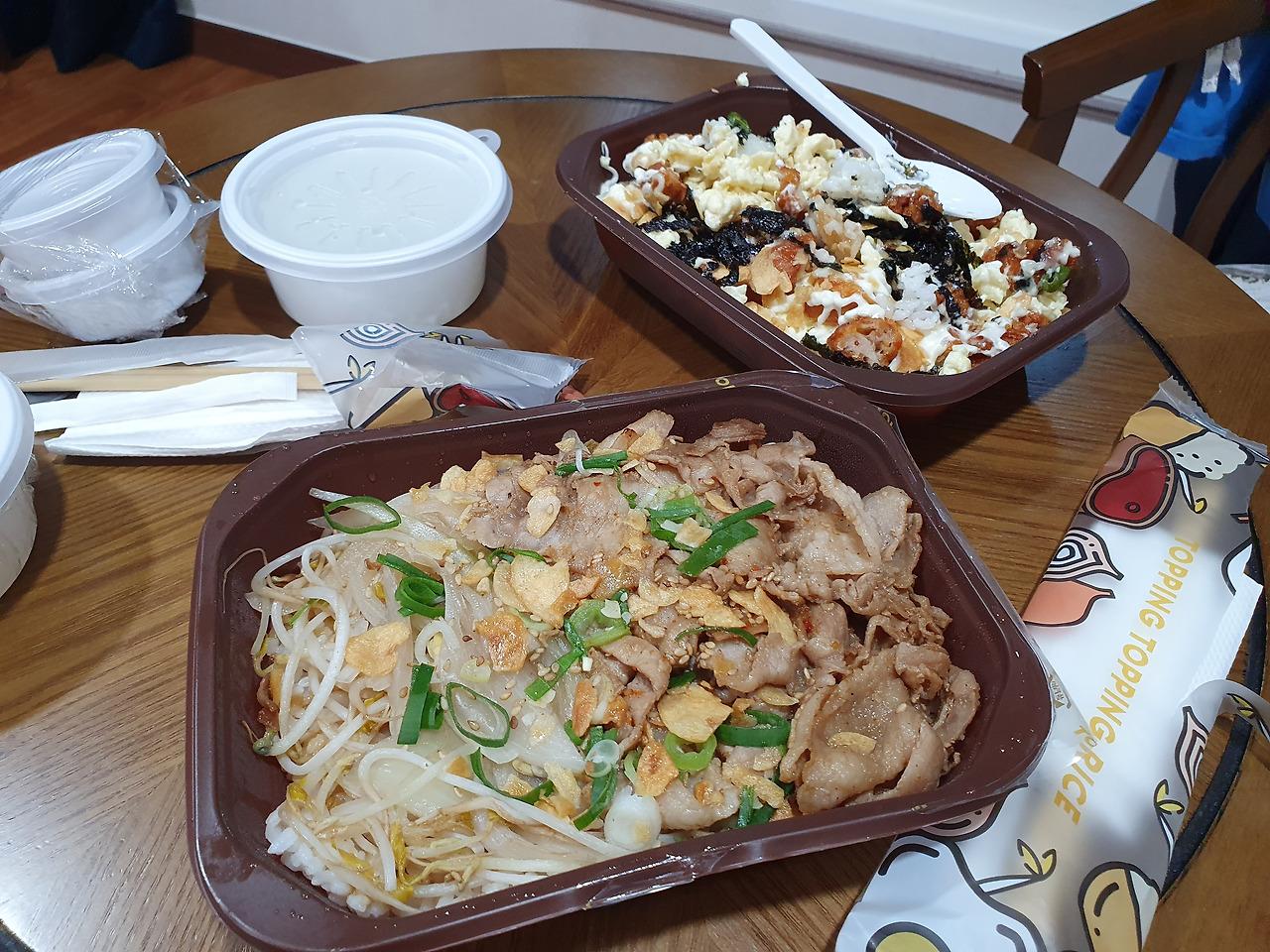저는 제육덮밥을 먹었고, 새싹이는 치킨마요덥밥을 먹었어요.