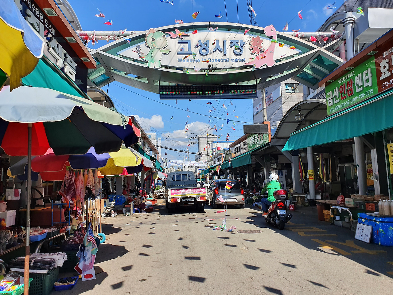 고성박물관을 한 바퀴 둘러보고 나와서 가까운 '고성시장'으로 향했습니다. 새싹이가 관광지도를 보더니 '고성공룡시장'에 가보자고 말했는데, 가서 보니 그냥 '고성시장'이었어요. 둘이 다른 건지 같은 건지는 아직도 모르겠어요. 바로 옆에 붙어있는 건지 어떤 건지. 고성을 대표하는 관광 아이템이 '공룡'이라서 그런지 여기저기 다 '공룡'이 붙어있어서 좀 헷갈리기도 했습니다. 시장 간판에도 공룡 그림이 있는 거 보이시죠?^^; 가보면 그냥 시골 상설 시장이에요.