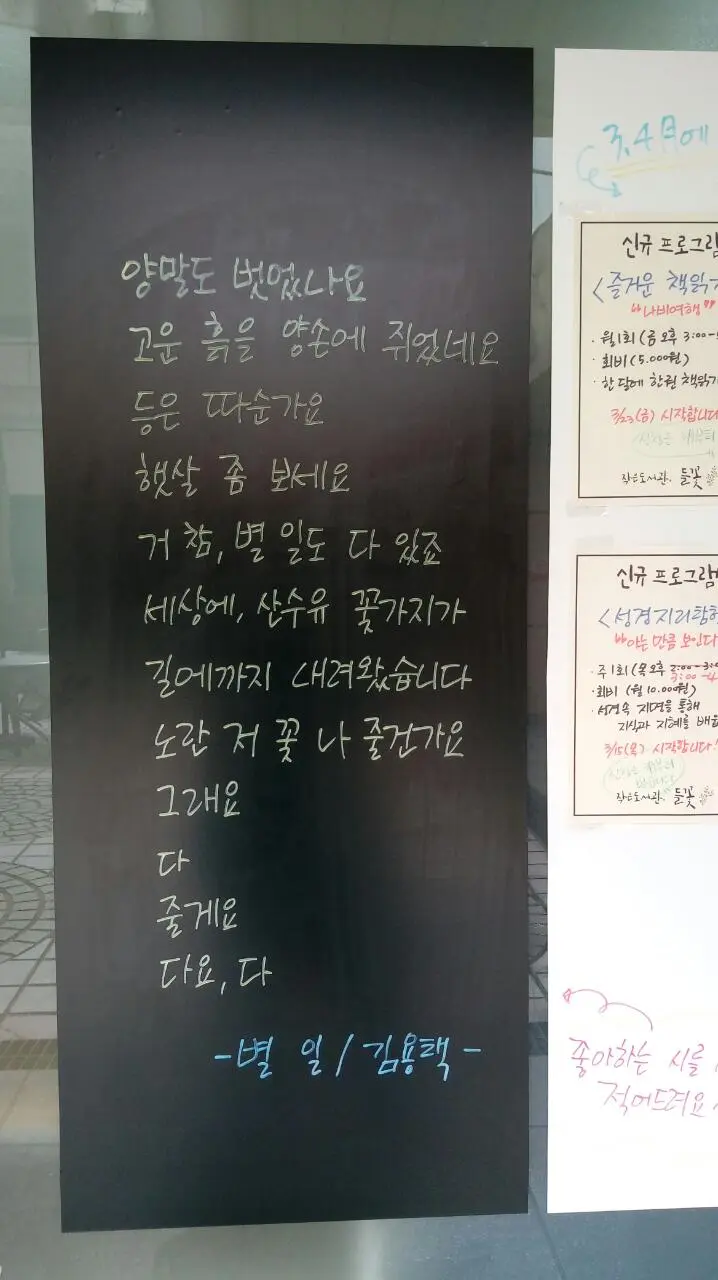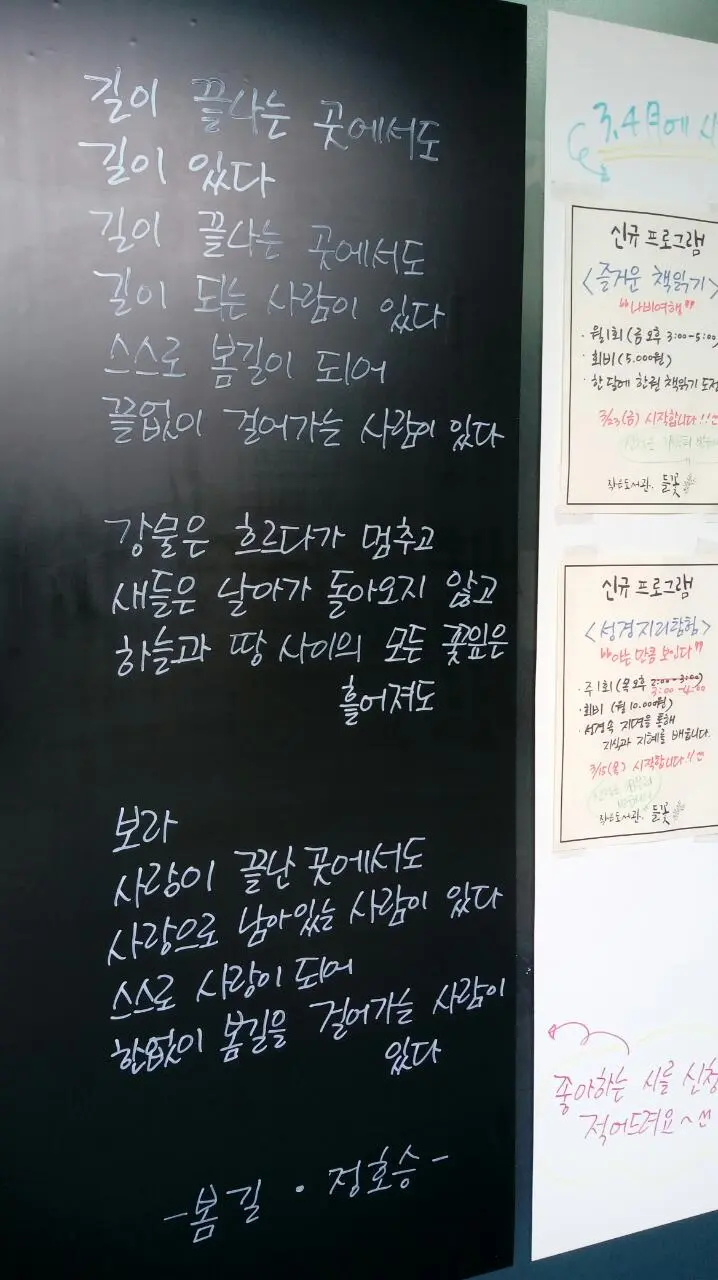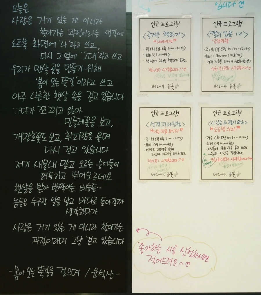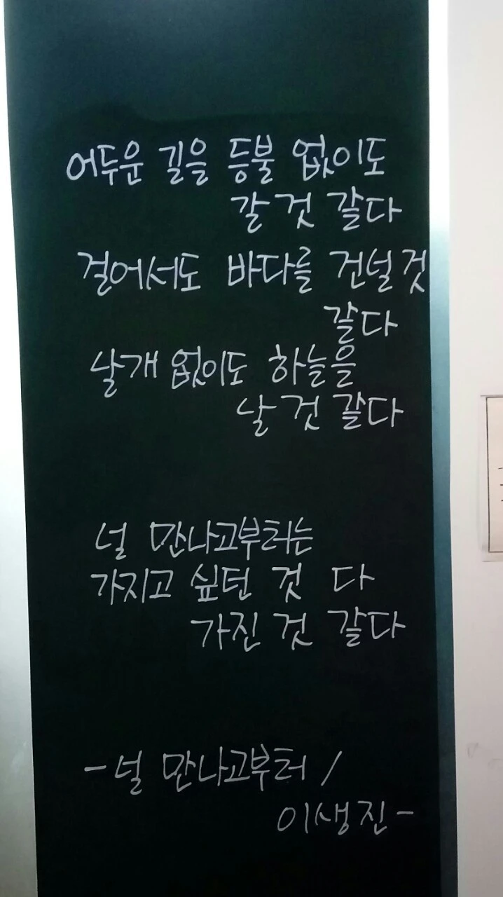 문을 열고 들어오진 못하고 바깥에서 기웃거릴 때 가장 잘 보이는 공간이 시를 적어 놓는 이 칠판이었다.