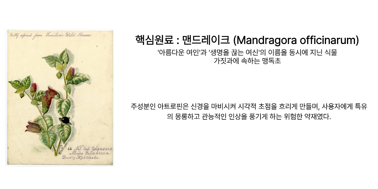 ‘마녀의 약초’이나 ‘광란을 유발하는 약초’라는 전승은 학술적 해설이라기보다는, 고대 문헌에 등장하는 상징적 사례들을 활용한 수사적 재구성에 가깝다. 그럼에도 불구하고, 이러한 이야기에는 벨라돈나가 실제로 인간의 감각을 둔화시키고 의식에 변화를 주었던 역사적 맥락이 투영되어 있다. 즉, 인류의 신경을 자극하고 이성을 흐트러뜨리는 위험성에 대한 인식이 반영된 것이라 생각한다.