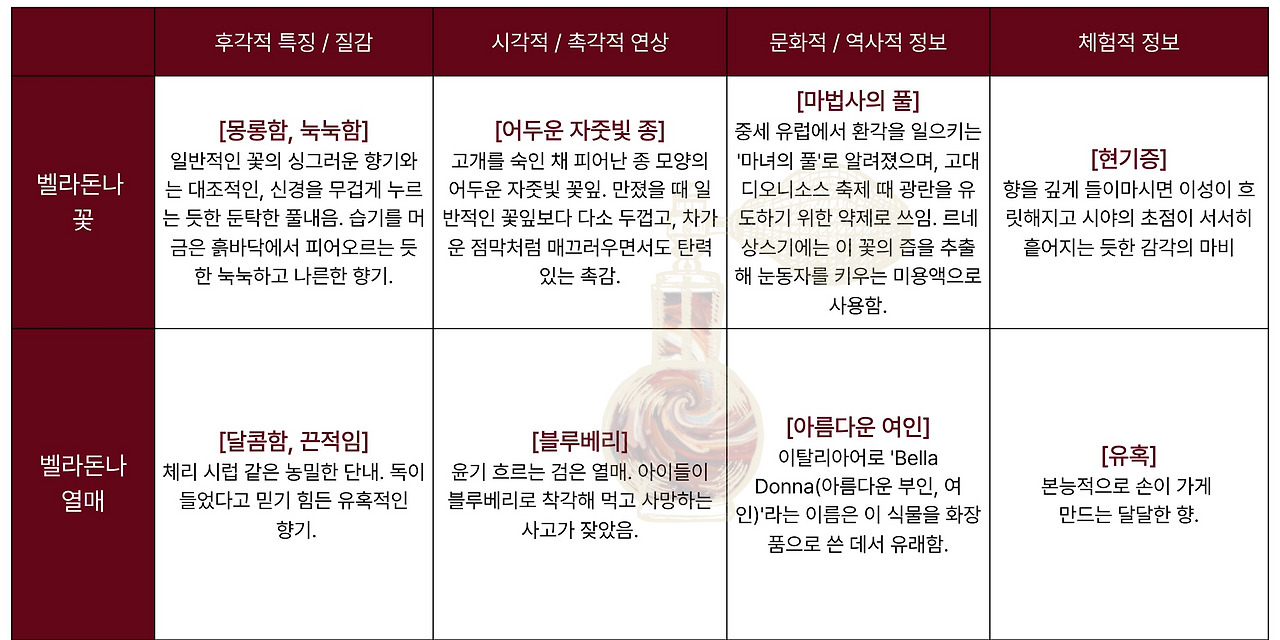 -벨라돈나 꽃은 화려하지 않은 암갈색이나 자주색을 띤다. 일반적인 꽃에서 느낄 수 있는 싱그러운 향기와는 거리가 멀며, 오히려 신경을 둔화시키는 듯한 무겁고 눅눅한 풀 내음과 동물적인 머스크 향이 어우러진다.