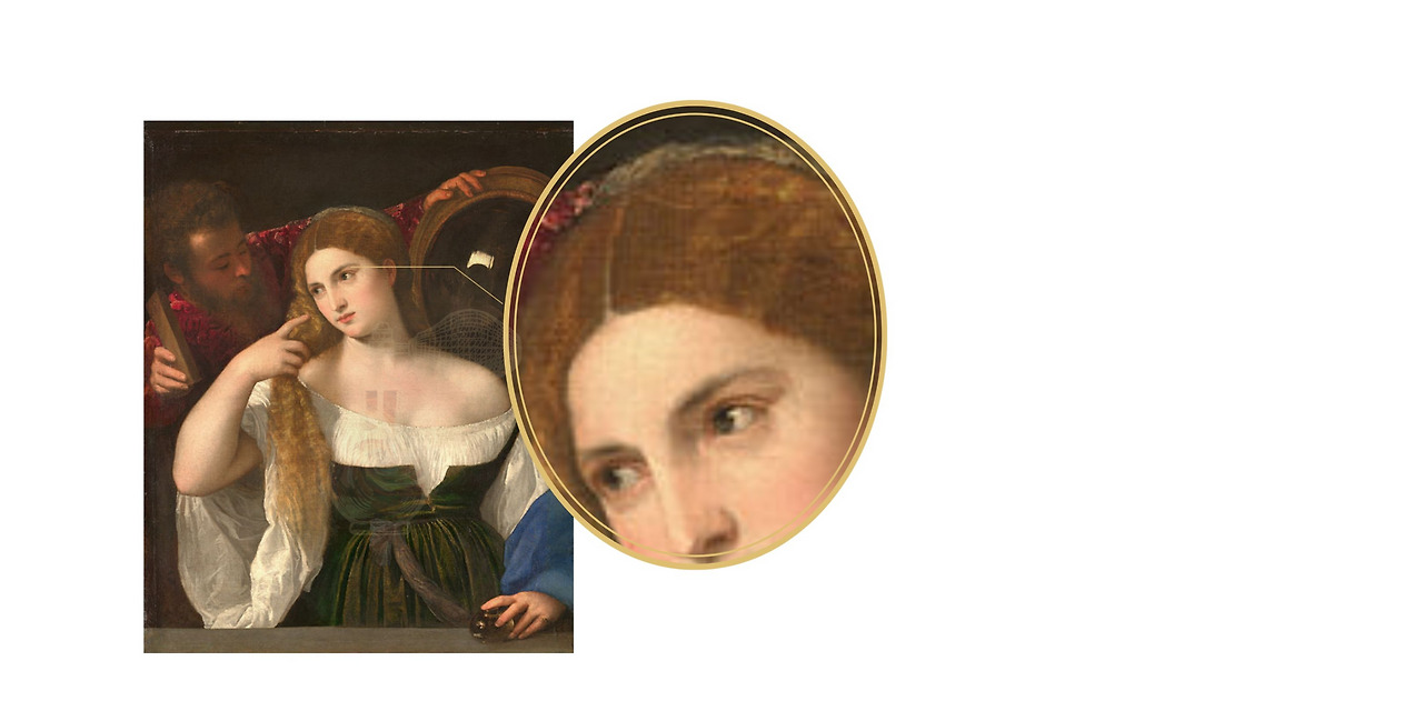 16세기 베네치아의 미적 기준에서 ‘아름다운 눈’은 단순히 형태의 아름다움만을 의미하지 않았다. 동공이 크게 확장되어 깊이를 가늠할 수 없을 만큼 신비롭고, 촉촉한 광택이 감도는 눈망울이 매력으로 여겨졌다. 티치아노는 이 같은 특성을 표현하기 위해 눈의 윤곽을 흐릿하게 처리하고, 동공에는 짙은 유채 물감을 여러 번 덧칠함으로써 검은 심연을 들여다보는 듯한 인상을 주었다.