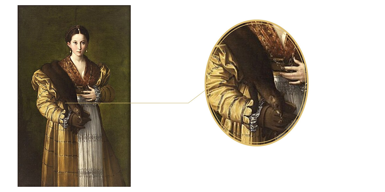 인물의 의상 또한 당대 귀족 사회의 화려한 복식 문화를 세밀하게 재현했다. 금색 자수가 놓인 드레스, 목을 감싼 진주 목걸이, 어깨에 둘러진 담비 모피 등은 인물의 높은 사회적 지위를 시각적으로 강조한다. 특히 담비 머리에 더해진 정교한 금장식은 16세기 이탈리아 상류층의 사치스러운 유행을 반영한다. 화가는 빛의 반사를 섬세하게 묘사하여 직물의 질감을 극대화했고, 이로 인해 인물의 신비로운 카리스마가 더욱 도드라진다.