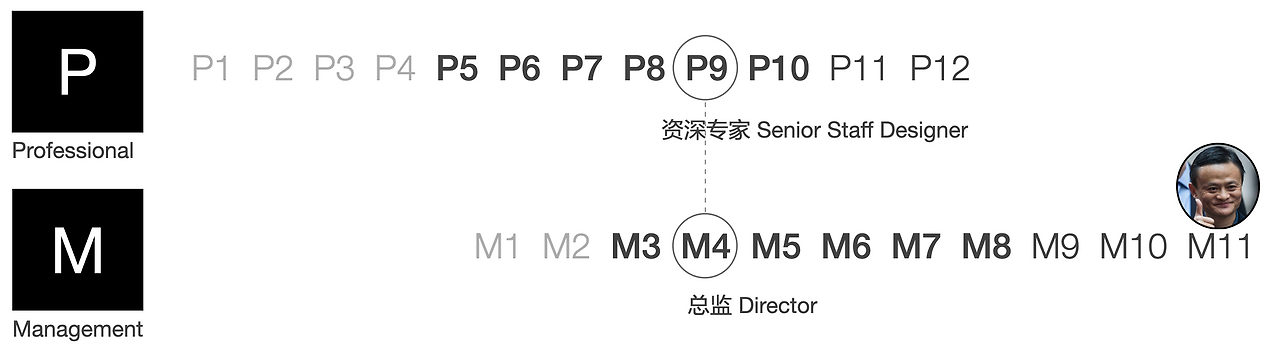 표기방식은 트랙 알파벳 첫 글자와 숫자를 조합하여 P5, M5 같은 형식으로 표현한다. 숫자가 높을수록 높은 직급이라고 이해하면 된다. 위 이미지에서 굵게 표현된 부분, 즉 P5~P10, M3~M8까지가 주요 직군 분포라고 이해하면 된다. M9는 总裁(총재) 레벨로 거의 계열사 CEO 정도의 높은 직급이다. 대학을 갓 졸업한 주니어 디자이너의 경우는 대부분 P5로 시작하게 되는 경우가 많고, P6은 시니어 디자이너, P7부터 디자인 전문가라는 타이틀이 쓰인다. 직급의 높낮이를 굳이 비교한다면 위의 이미지처럼 P6과 M1이 대응하여 같은 레벨로 보면 된다.