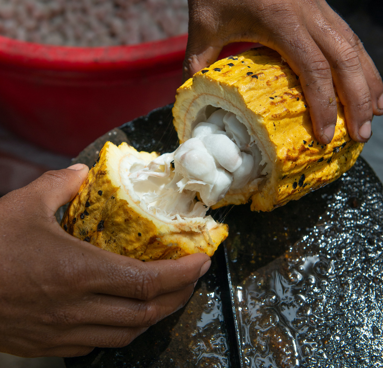 반으로 쪼개진 코코아 열매들이 테이블 위에 놓인다. 열매 속 알갱이들은 우윳빛으로 하얗다. 몽글몽글하면서도 탱탱한 질감이 금방이라도 흘러내릴 것처럼 탐스럽다. 우리의 표정을 슥 둘러본 아주머니 사장님은 '카카오 열매는 사실 까맣지 않고 하얗답니다'라며 운을 띄운다.