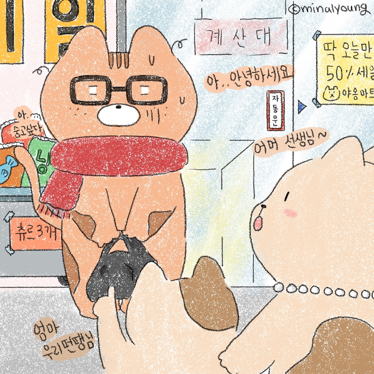 "떤땡님 마트 다녀왔어요? 앗 맥주다! 떤땡님도 술 먹어요? 우리 아빠도 좋아하는데!"