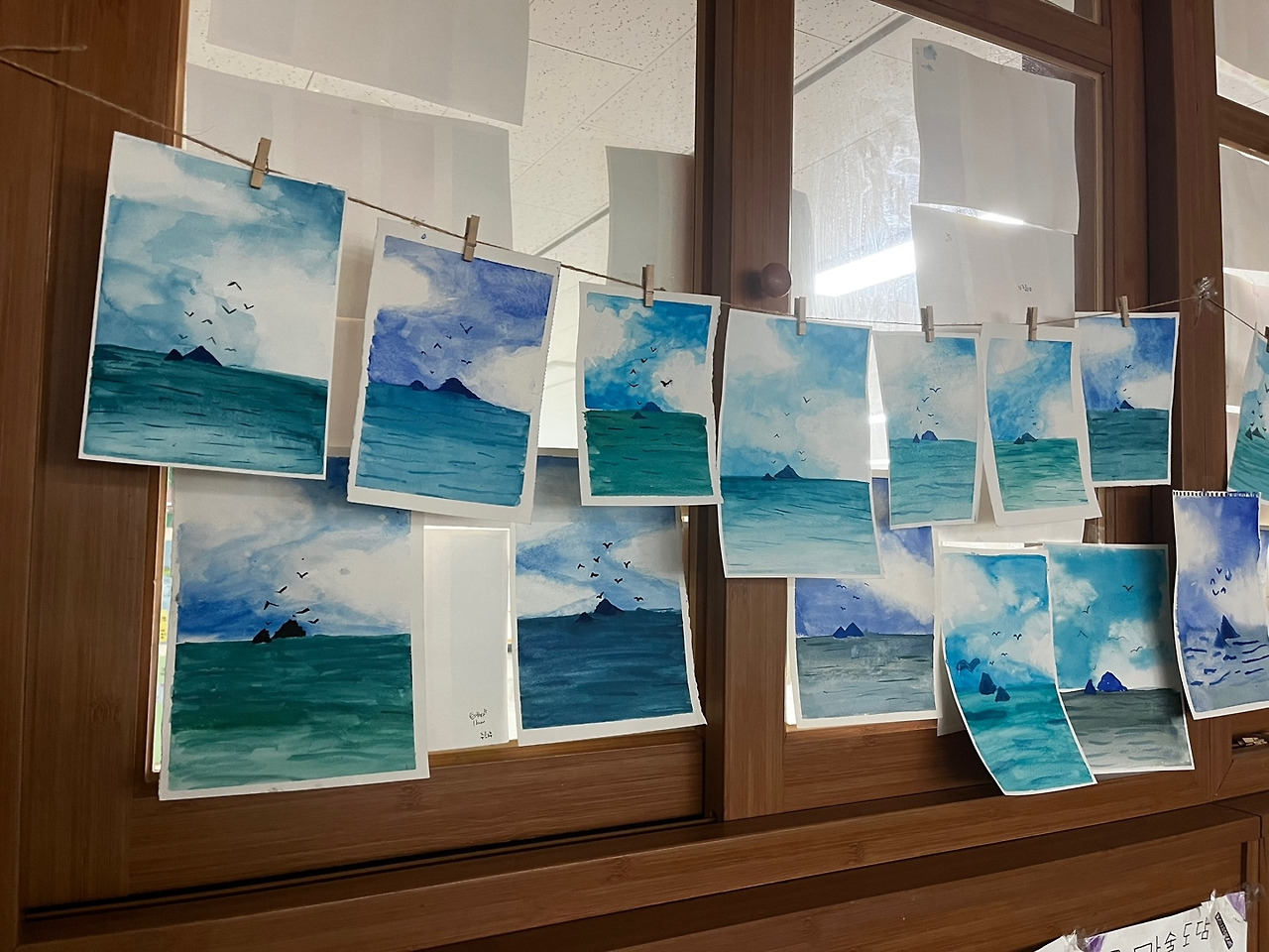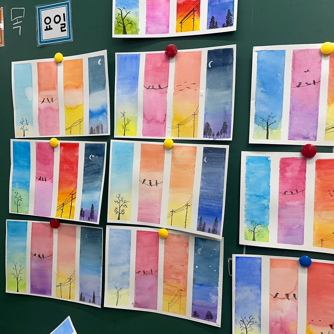 오일파스텔로 미술에 대한 두려움도 좀 가라앉혔겠다, 까다롭지만 언젠가 사용해야 할 필수 재료라면 지금이 시작하기에 가장 빠른 때가 아닐까. 아이들을 가르치기 위해 수업이 끝나면 수채화 재료를 한껏 펼쳐놓고 맹연습을 했다. 수많은 유튜브 선생님들의 도움을 받으며 겨우 가르칠 수준으로 끌어올렸다. 꾸준히 아이들에게 할 수 있다며 격려하며 가르쳤다.