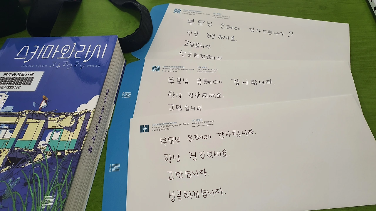 그리고 부모님께 짧은 편지를 쓴다.