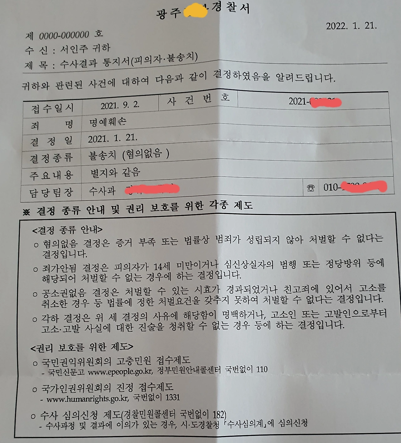 지난 9월. 명예훼손으로 고소되어 무겁게 날 짖누르는 억압감에서 해소된 건 등기우편 하나에서다.