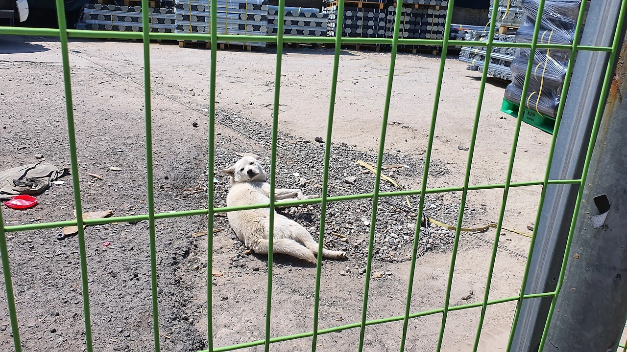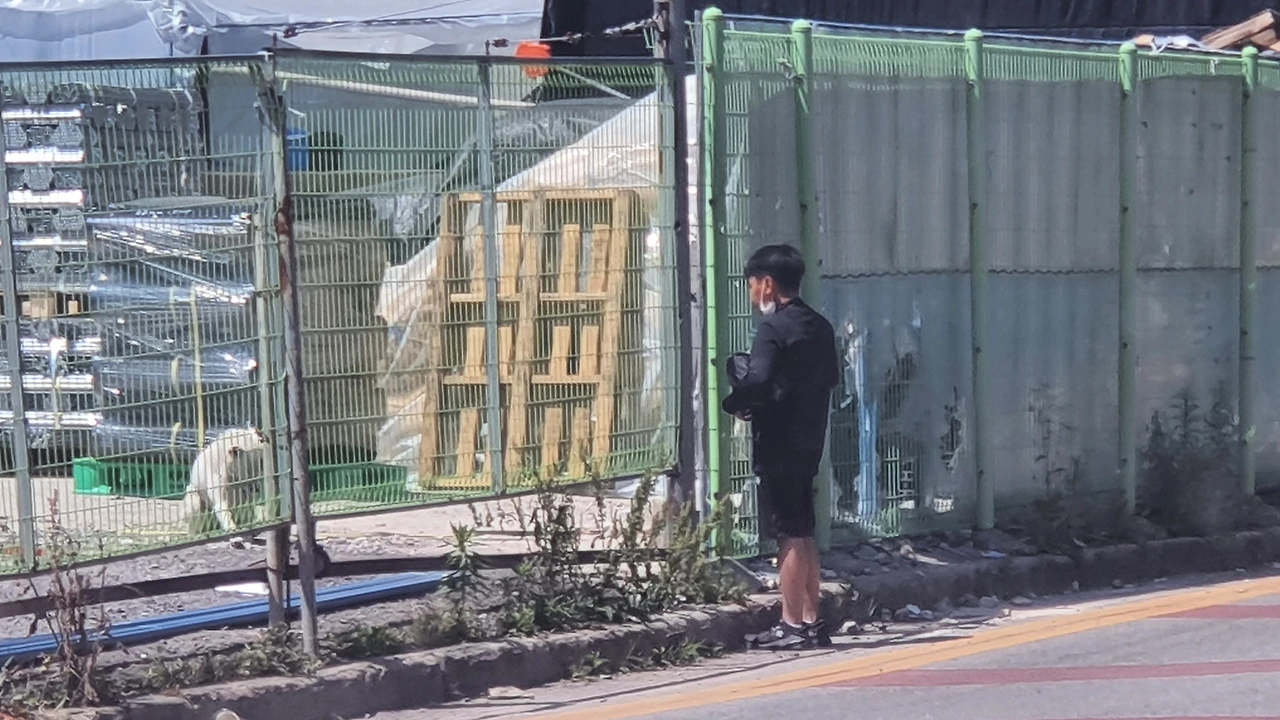 생후 6개월 정도의 백구는 목줄에 매인 채 시멘트 바닥에 엎드려 있다. 이 모습이 눈에 밟혔던지 소년은 가던 길을 멈추고 무언가를 고민하기 시작했다. 백구 역시 소년을 바라보며 무언가를 말하는 듯 하다.