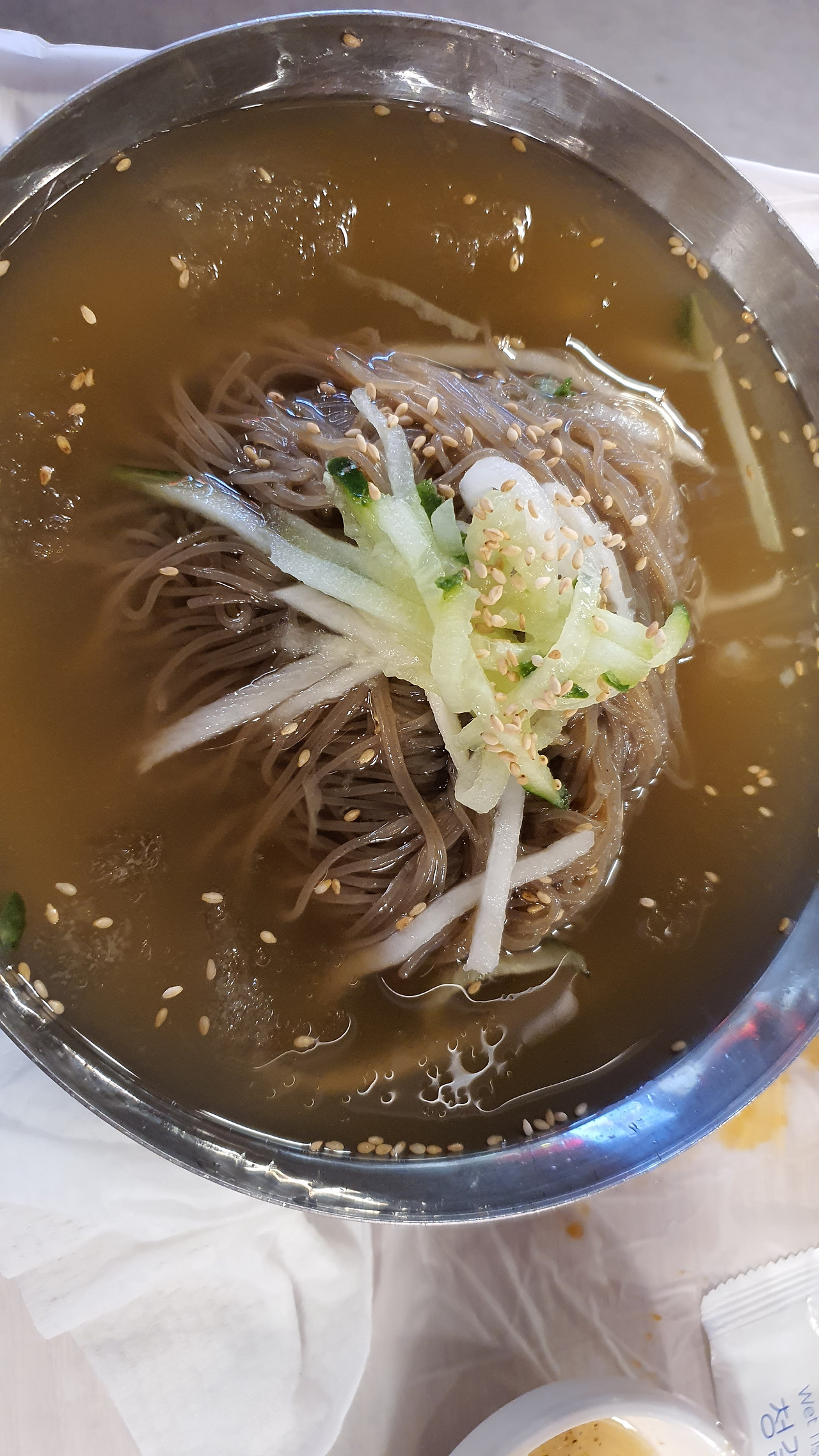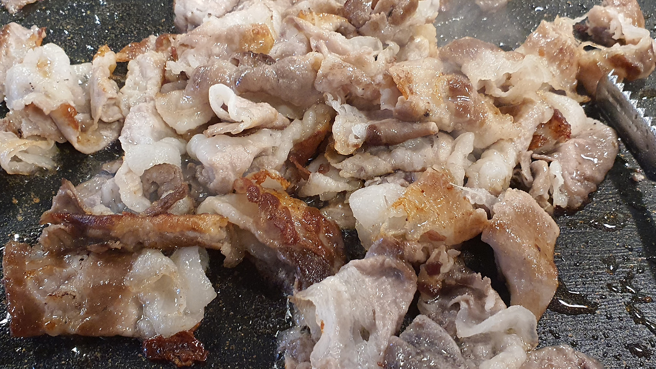 대패삼겹살은 불판위에서 춤을 추다 이내 입속에서 사라졌다. 고소하고 맛있다. 허리띠 단추를 하나 풀어가며 행복한 점심 만찬을 이어갔다. 마지막으로 후식냉면까지 시키니 더는 들어갈 곳이 없다.