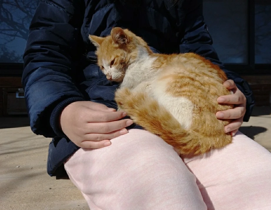 노란 들고양이 한마리와 찍은 사진이다. 시골에서 무리를 지으며 돌아다니는 고양이 가운데 가장 마른 아이에게 밥도주고 물도주고 돌봐주니 졸졸 따른다.