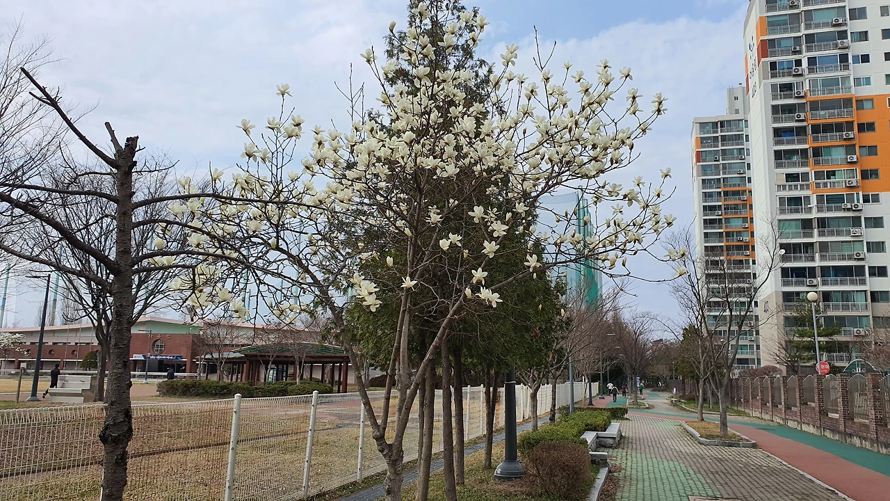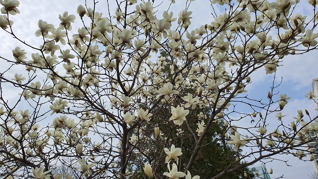 멀리 목련꽃이 만개했다. 같은 꽃을 보지만 작년과 올해의 느낌은 180도 다르다.