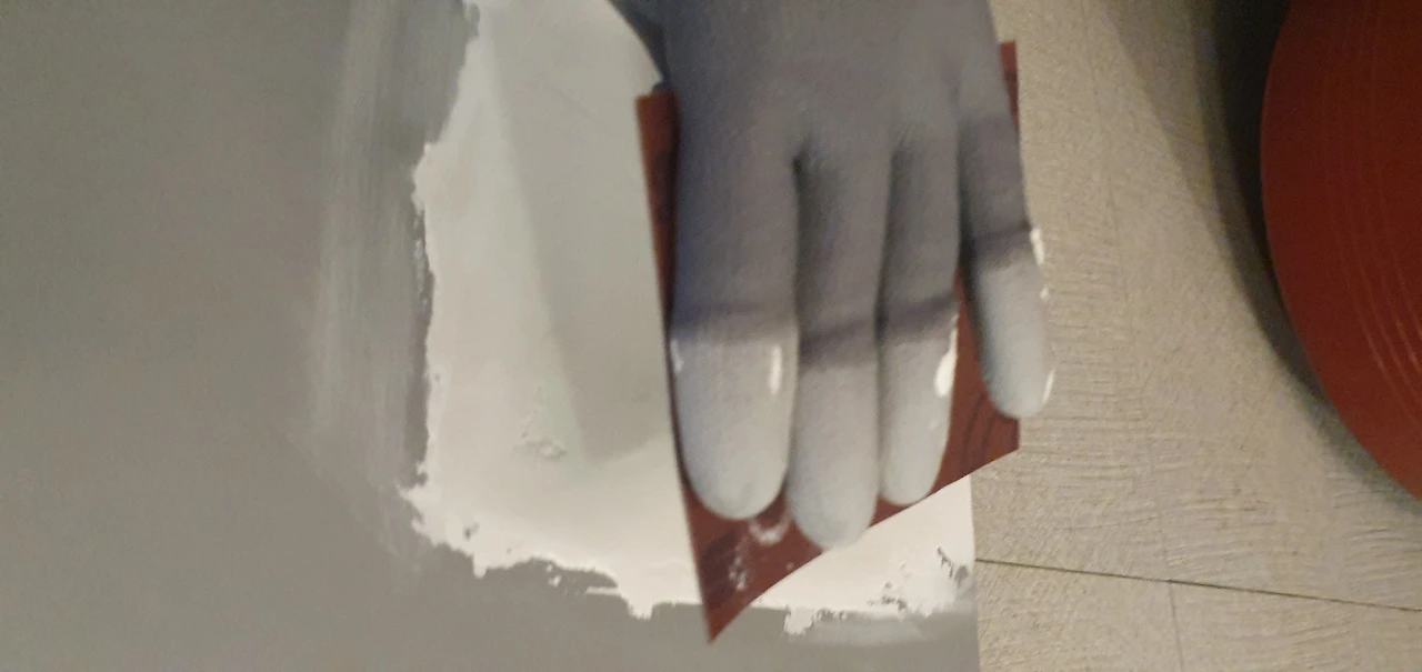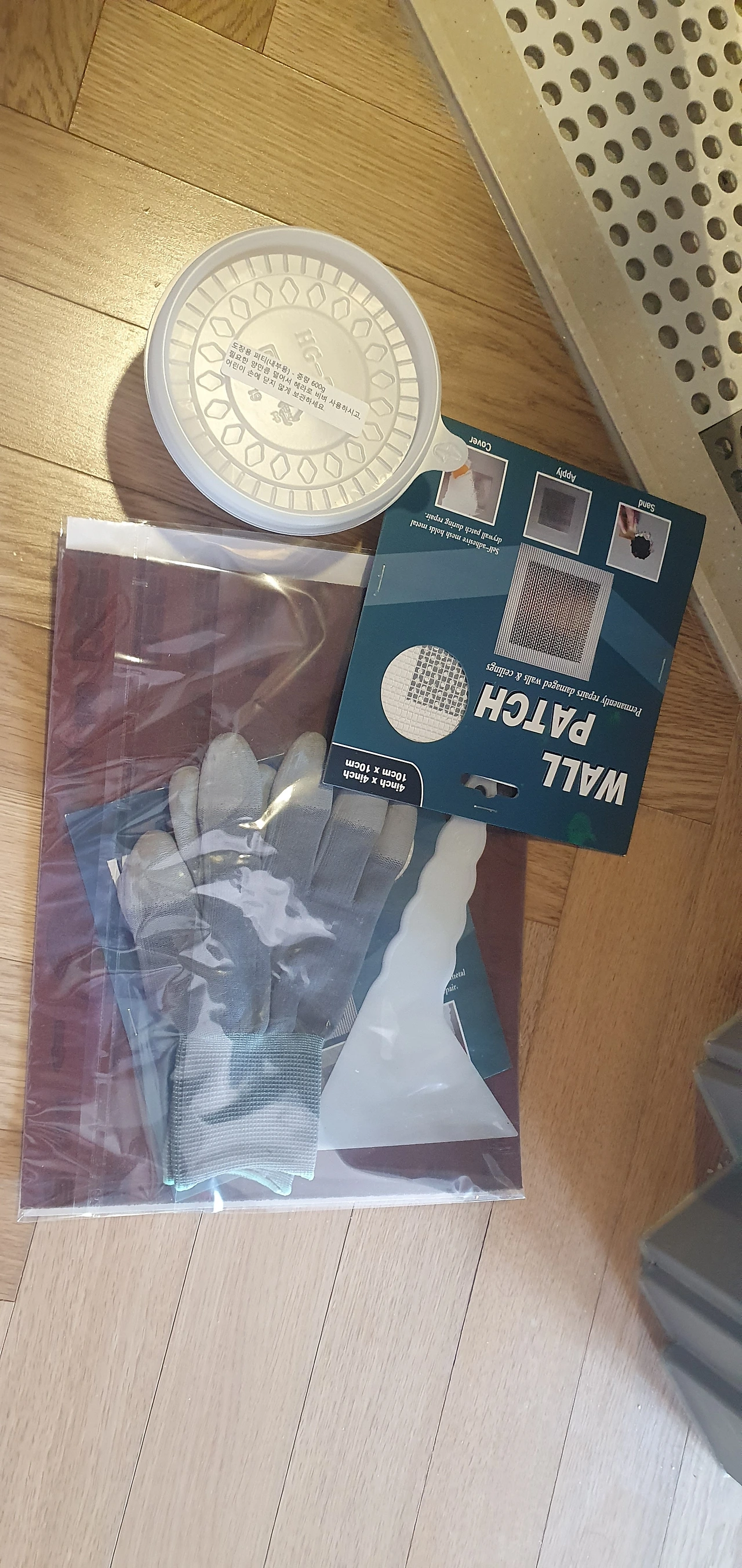 방법을 잘 살펴보며 구멍 난 곳에 패치스티커 붙이고 핸드코트를 적당한 양을 퍼서 헤라로 이용해 얇게 발라주었다. 그런다음 건조하기까지 기다린다. 드라이기로 말려주면 금방 마른다. 그래서 나는 드라이기로 말려주었다.