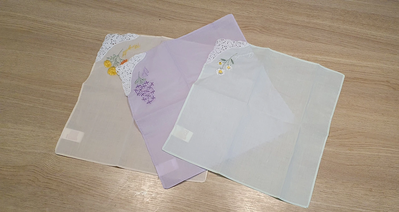 이건 면 레이스자수 60수 손수건이다. 이것도 다이소 봄 신상품인데 그냥 이뻐서 샀다. 그래도 이걸로 음식 흘렸을 때나 묻었을 때 닦으면 좋겠다 싶었다.