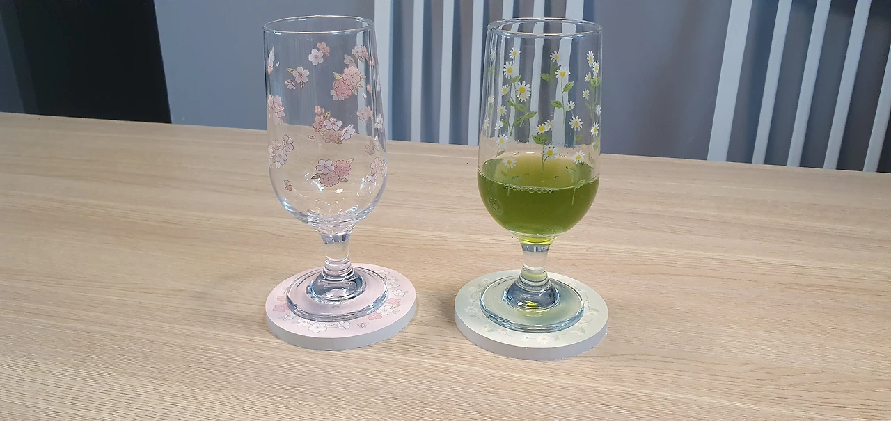 봄봄 유리잔도 이뻐서 샀다. 워낙 에이드를 잘 먹는 나에게 필요했던 쥬스잔. 여기에 청포도 에이드를 부어보니 너무 이뻤고 다이소에서 추가로 산 컵받침까지 올려놓으니 홈카페에 온 기분이였다.