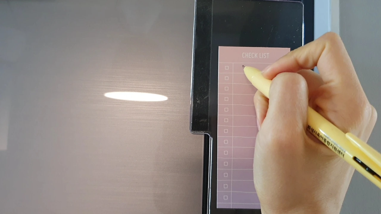 이건 모니터 투명보드인데 냉장고에 붙였다. 냉장고에 필요한 재료 사야할 때 알아야해서 여기다 붙였고 메모지를 붙여 필요한거나 해야할 일들을 적었다.