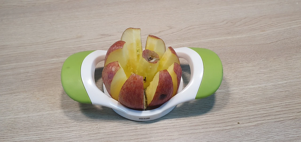 사과 커터기도 샀다. 힘을 좀 주고 밑에 잘 받쳐진 상태로 해야 이런식으로 8조각 잘 낼수가 있다.