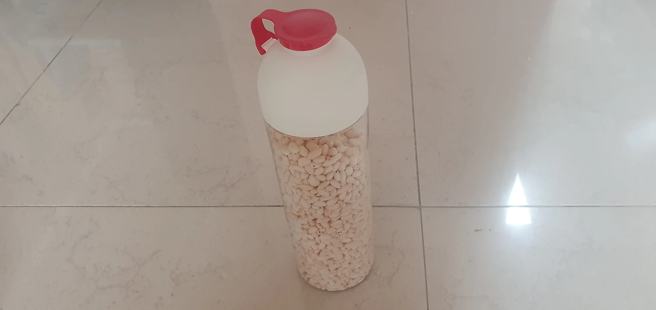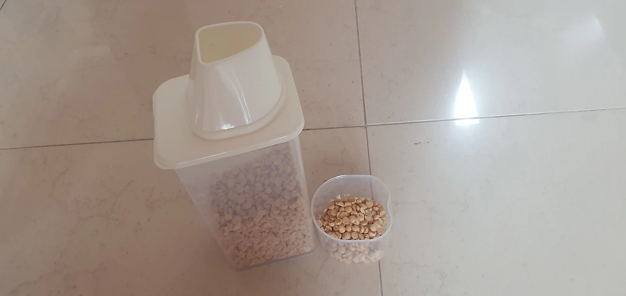 다이소에서 산 곡물저장용기이다. 가격도 저렴하고 가성비 만족이여서 유용하게 쓴다. 정리수납에 탁월해서 잘 쓰게 된다. 현미도 먹고 있어서 여기에다 현미 넣어 냉장보관중이다.