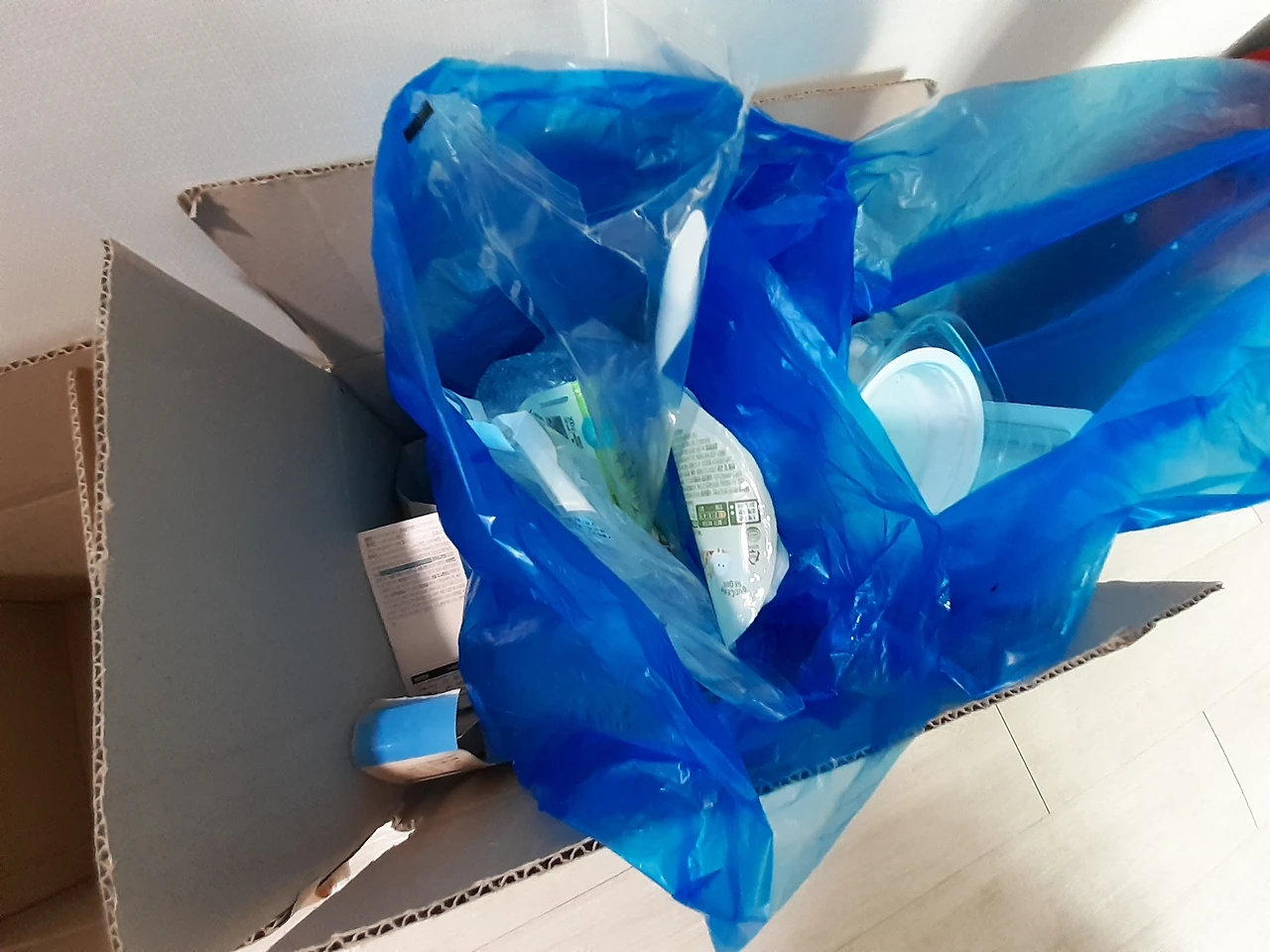 분리수거 편안하게 하기위해 나는 큰 상자로 활용하고 있다. 큰 상자 속에 파란 두 개의 비닐을 넣어 저런식으로 펼쳐 하나는 비닐, 다른 하나는 플라스틱으로 분류에 넣고 있다.