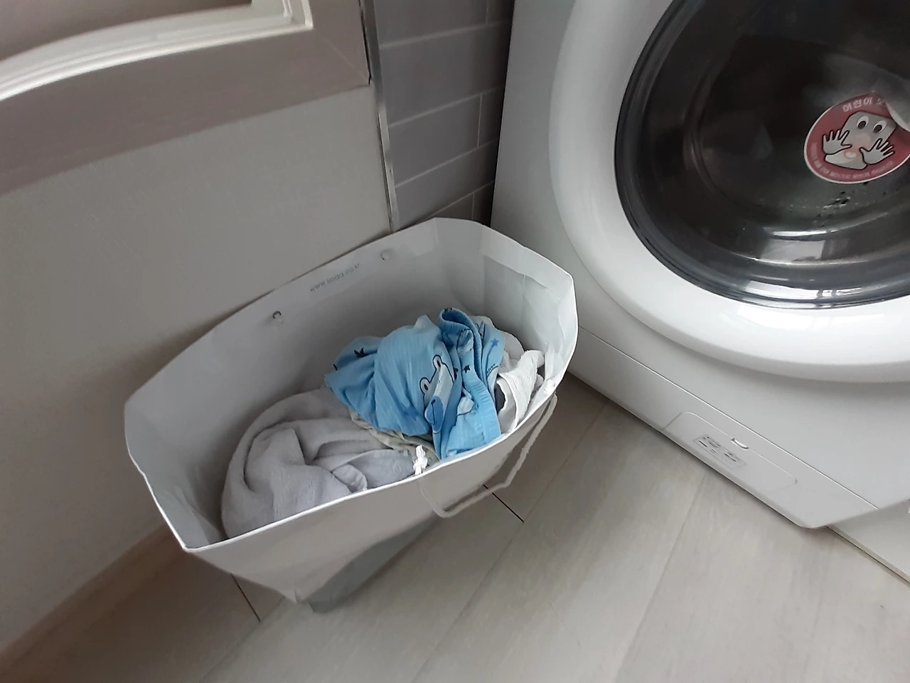 집에 빨래통 있지만 어차피 레지던스에 3개월 지낼것이기에 쇼핑백으로 빨래통 대용으로 쓰고 있다. 구김이 다소 있지만 아직까지 별 문제가 없어 잘 쓰고 있다. 어차피 매일 아침마다 빨래하기 때문에 딱 이 정도 크기의 쇼핑백으로 잘 활용하고 있다.