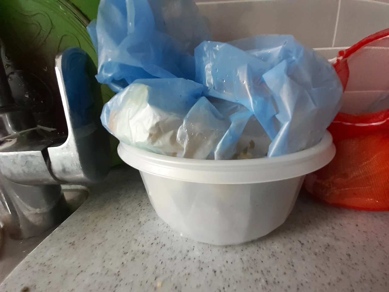 비닐봉투에는 음식물쓰레기들이 들어있다. 레지던스 주인분께서 이 봉투에 밀봉하여 버리라고 하셔가지고 봉투가 쌓일 때 쓰러지지 않게 하려고 동그란 플라스틱통에 담아 받침으로 쓰고 있다. 물기 걱정도 없고 쓰레기 버리려 갈 때 플라스틱 들고 처리 할 수 있어 잘 활용하고 있다.