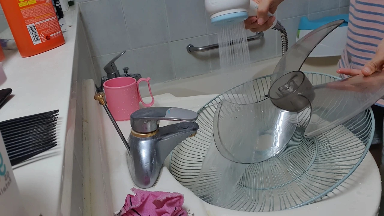 나는 선풍기 보호망과 날개 가지고 욕실에 들어갔다. 샤워기로 먼지를 내리게하고 샴푸로 이용해서 보호망 사이사이를 수세미로 문지른다음 샤워기로 헹궈냈다.
