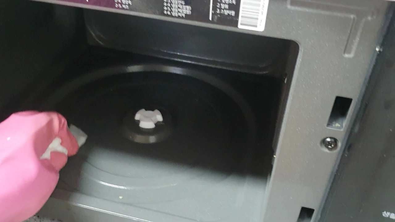 돌린 후 문을 열면 열기와 김이 남아있는데 사라지기전에 행주로 열심히 전자레인지 내부를 구석구석 닦아준다.