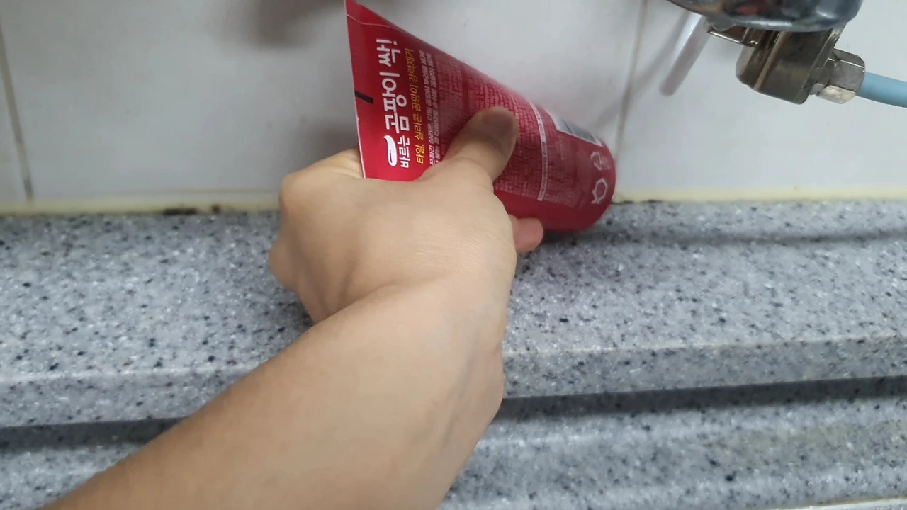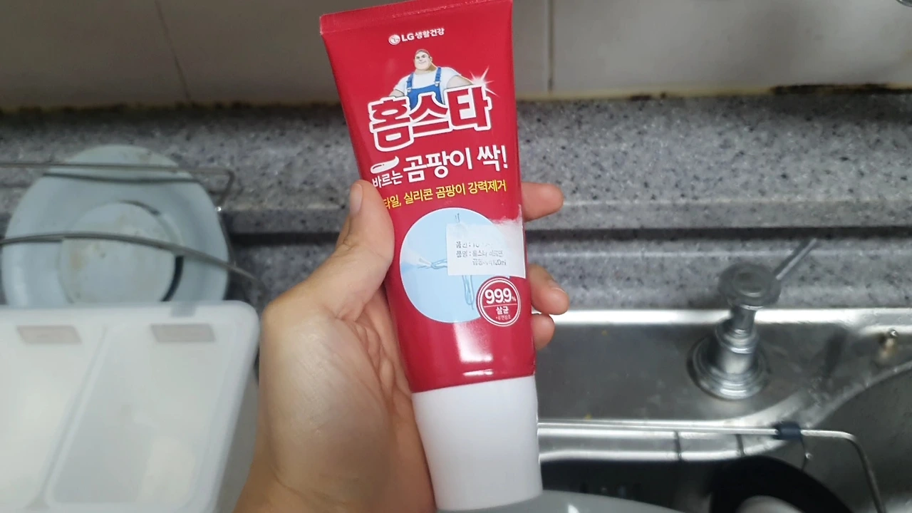 주방 싱크대위쪽 실리콘에 곰팡이가 있다. 곰팡이가 심각하게 자리잡힌걸 보고 나는 다이소에서 급하게 곰팡이 제거젤을 샀다. 곰팡이 부분에 잘 발라준 후 24시간 지나 다시 살펴보았다.