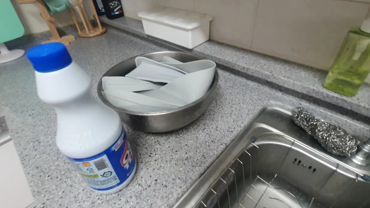통에 물을 가득 담아 싱크대물막이를 넣어준다. 그런다음 락스를 소량 부어 하루정도 담가주면 곰팡이들이 깨끗하게 없어진다.