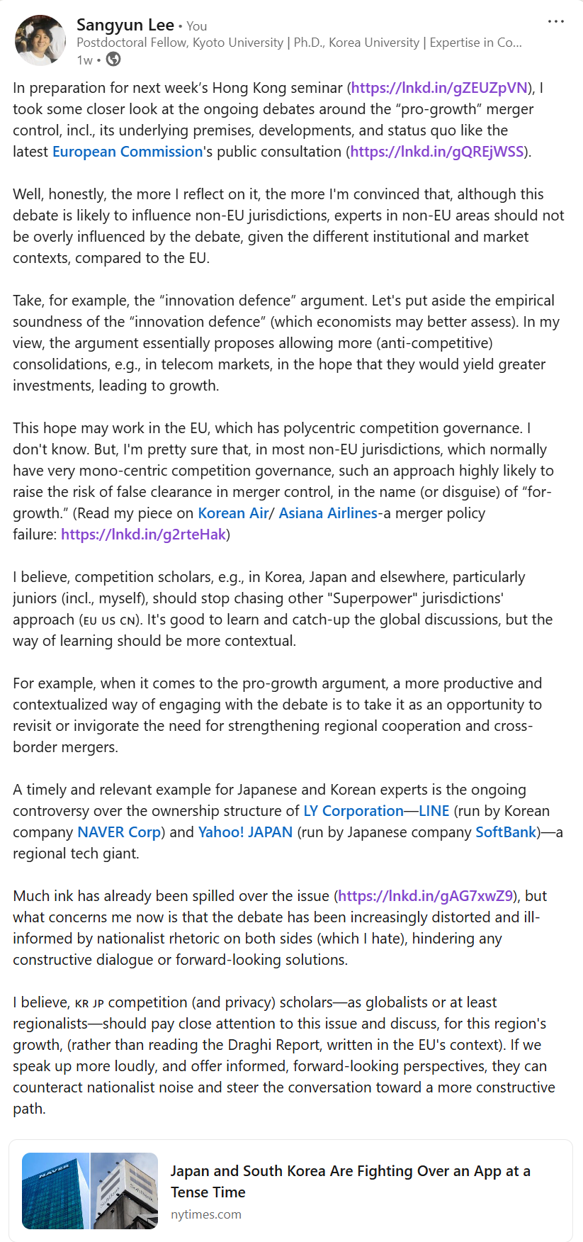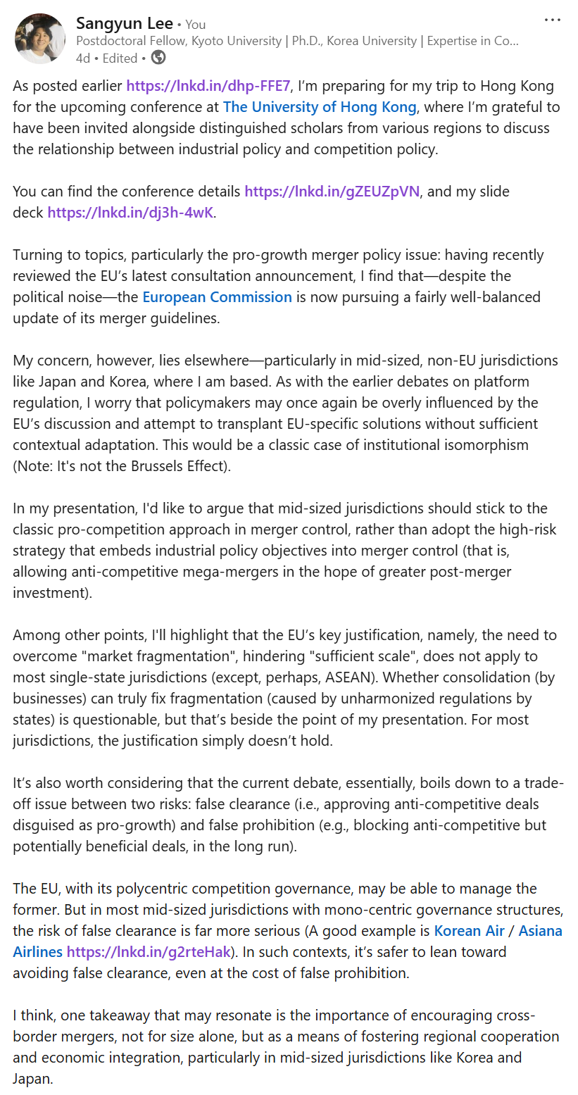 내 발표는 "On the 'Pro-Growth' Merger Policy"를 제목으로, 드라기 리포트(Draghi report) 등을 통해서 제안되고 있는 이른바 '친성장 기업결합 정책'을 비유럽권(non-EU) 시각에서는 어떻게 해석하고 받아들일 것인가가 주된 내용이었고... 이미 행사 전부터 링크드인에 주요 내용을 공유해두었기 때문에, 발표 자체는 짧게 했고 내용과 메시지도 비교적 단순하게 했는데, 나쁘지 않았던 것 같다.