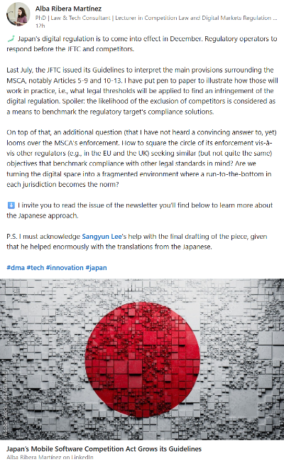 Personally, I hope that through the MSCA, the JFTC will gain broader public support, and through this it could successfully reinvigorate the strong enforcement, a process that has already begun to take shape! https://lnkd.in/gbTG4DJv