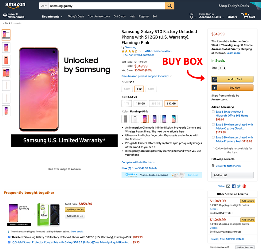 다음으로, 사건의 초점은 아마존의 “Buy Box” 관련 이슈로 모아진다. “Buy Box”는 페이지 우측 상단에 위치한 구매박스로서 소비자들은 이를 통해 한번의 클릭으로 상품을 바로 구매하거나 카트에 담을 수 있다(아래 그림 참조). 아마존은 여러 사업자들이 동일한 품목을 판매하는 경우 이 중 한 업체를 선정하여 그의 상품을 “Buy Box”에 위치시키는데, 아마존을 통한 거래 중 최소 80% 이상이 이 “Buy Box”를 통해 이뤄질 정도로 영향력이 상당한 것으로 알려져 있다. 이번 사건에서 문제되는 부분은 이 "Buy Box" 상품의 선정 기준과 관련되어 있는 것으로 보인다. 독일 경쟁당국에 따르면, 업체들은 그동안 아마존이 거래 데이터를 이용하여 부당하게 자사의 상품을 유리하게 취급해왔다고 주장한다고 한다. 구체적으로, 아마존이 판매하는 상품의 경우와 달리 외부업체들의 경우 아마존을 통한 거래가 이뤄지면 소비자들로부터 품목 및 판매자에 대한 평가를 받는데, 이때 받는 부정적인 평가들이 “Buy Box” 선정 시 불리하게 작용해왔다는 것이다. 이 문제는 독일 경쟁당국의조사에서는 다뤄지지 않은 부분으로서, 집행위는 현재 이 문제를 중점적으로 살피고 있는 것으로 알려지고 있다(BKartA, 2019, pp.5-6).