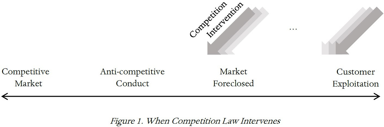 물론 관점에 따라서 경쟁 당국의 개입 시점에 대한 판단은 다를 수 있다. 예컨대, 아래 그림[A]에서 표현한 것처럼, 시카고 학파(Chicago School)의 주장에 따르면 (카르텔처럼) 맨 오른쪽 극단의 착취가 나타난 경우에만 경쟁법이 나서는 것이 맞고, 포스트 시카고 학파(post-Chicago), 질서자유주의(ordo-liberalism), 하버드 학파의 구조주의, 또는 맹아이론(incipiency doctrine)의 입장에 따르면 좀 더 이른 시기에 경쟁법이 개입하는 것이 맞다. 하지만 결국 개입시기상의 차이일 뿐이다. 궁극적으로 경쟁법은 "exploitation"을 막기 위한 법이라는 걸 잊지 말아야 한다.