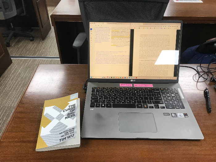 얼마 전, 연구실 모임에서 팀 우(Tim Wu)의 "The Curse of Bigness: Antitrust in the New Gilded Age"를 선정하여 실원들과 함께 읽었다. 각자 읽어온 뒤 한 파트씩 맡아 발표하고 생각을 나누는 시간을 가졌는데 정말 유익하고 좋았다. 교수님 말씀처럼, 하루 종일 이야기해도 부족할만큼 토론거리가 넘쳐났다.