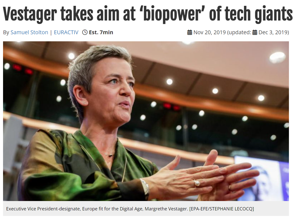 10) Samuel Stolton, 'Vestager takes aim at ‘biopower’ of tech giants' (Euractiv Nov 20, 2019) <https://www.euractiv.com/section/copyright/news/vestager-takes-aim-at-biopower-of-tech-giants/>