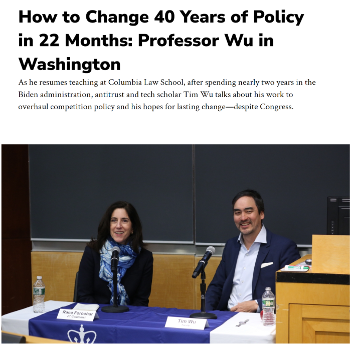2) Ben Remaly and Davide Mamone, ‘Tim Wu: the exit interview’ Global Competition Review (Jan 24, 2023) <https://globalcompetitionreview.com/gcr-usa/article/tim-wu-the-exit-interview>.