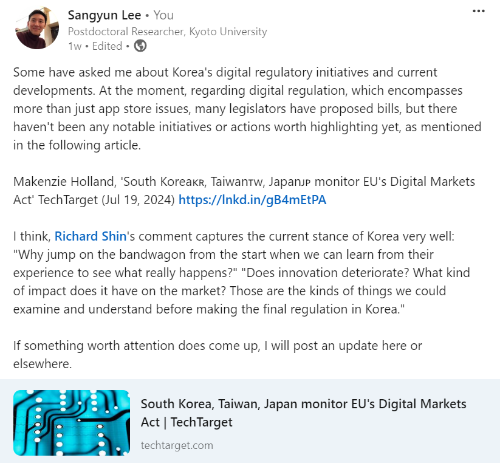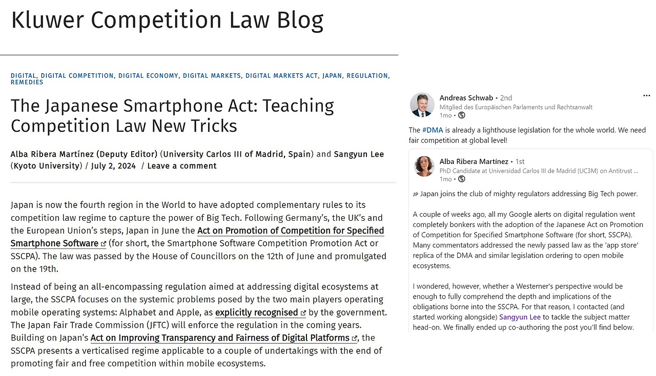 일본 스마트폰법은 법안 마련 초기부터 EU의 디지털시장법(Digital Markets Act, DMA)을 모델로 한 이니셔티브 중 하나로 주목받았고, 작년 한국에서도 국내 플랫폼법 도입 논의를 배경으로 언론에 의해 소개되면서 관심을 끌었었다. 또 최근에는 이번 입법 과정을 주도한 일본 공정거래위원회 디지털시장기획조사실 이나바 료타(稲葉 僚太) 실장의 인터뷰 기사(경향신문)가 나오면서 눈길을 끌기도 했다. 시기상 아직은 좀 이르지만, 현재 공정거래위원회가 플랫폼 부문을 향한 강력한 개입 의지를 다시 불태우고 있는 상황임을 고려하면 조만간 국내 학계에서도 관련 분석이 적지 않게 뒤따를 것으로 보인다.