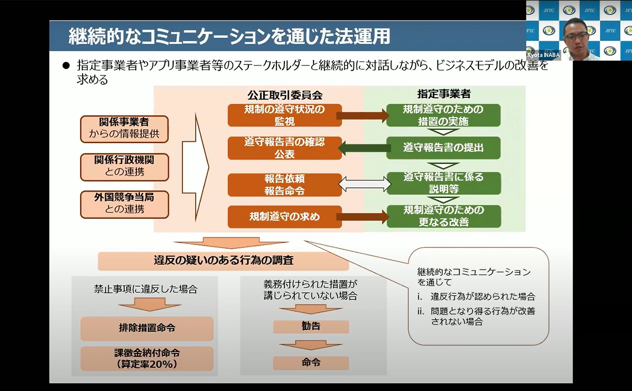 그동안 일본 공정거래위원회가 반복해서 강조해온 것처럼, 스마트폰법의 집행은 계층제적 지시 일변도가 아니라 상호 작용을 중시하는 방향으로 설계되어 있다. 이나바 료타의 설명을 빌리면, 스마트폰법은 기본적으로 2단계 접근 방식을 취하고 있다. 1단계에서는 지정 사업자로부터 연례 보고서(제14조) 등으로 정보를 제공 받고 이를 바탕으로 일본 공정거래위원회, 앱 개발자, 웹사이트 서비스 제공 사업자 등 이해 관계자, 다른 행정청(제43조) 및 외국 경쟁당국 등 다양한 행위자들이 소통하면서 문제를 발견하고 개선해가는 과정이 이뤄지게 진다. 이어 2단계에서는 이러한 과정에서 해결되지 않는 이슈들에 대하여 정부(일본 공정거래위원회)가 고권적으로 개입하여 문제를 조사하고(제15조, 제16조, 제51조) 권고나 배제조치 명령 등을 부과하는 방식의 위계적 접근이 이뤄지게 된다(40:15 지점부터 시작). 이러한 단계적 접근은 기본적으로 제3장 제1절과 제2절 규정들의 집행에 공통된 사안이며 둘 간에 본질적 차이는 없는 것으로 생각된다. 물론 제2절의 규정들이 좀 더 유연한 접근을 하고 있지만, 제1절에서도 제7조와 제8조 단서 규정 등 다양한 행위자들의 참여를 예정하고 있는 부분이 없지 않기 때문이다.