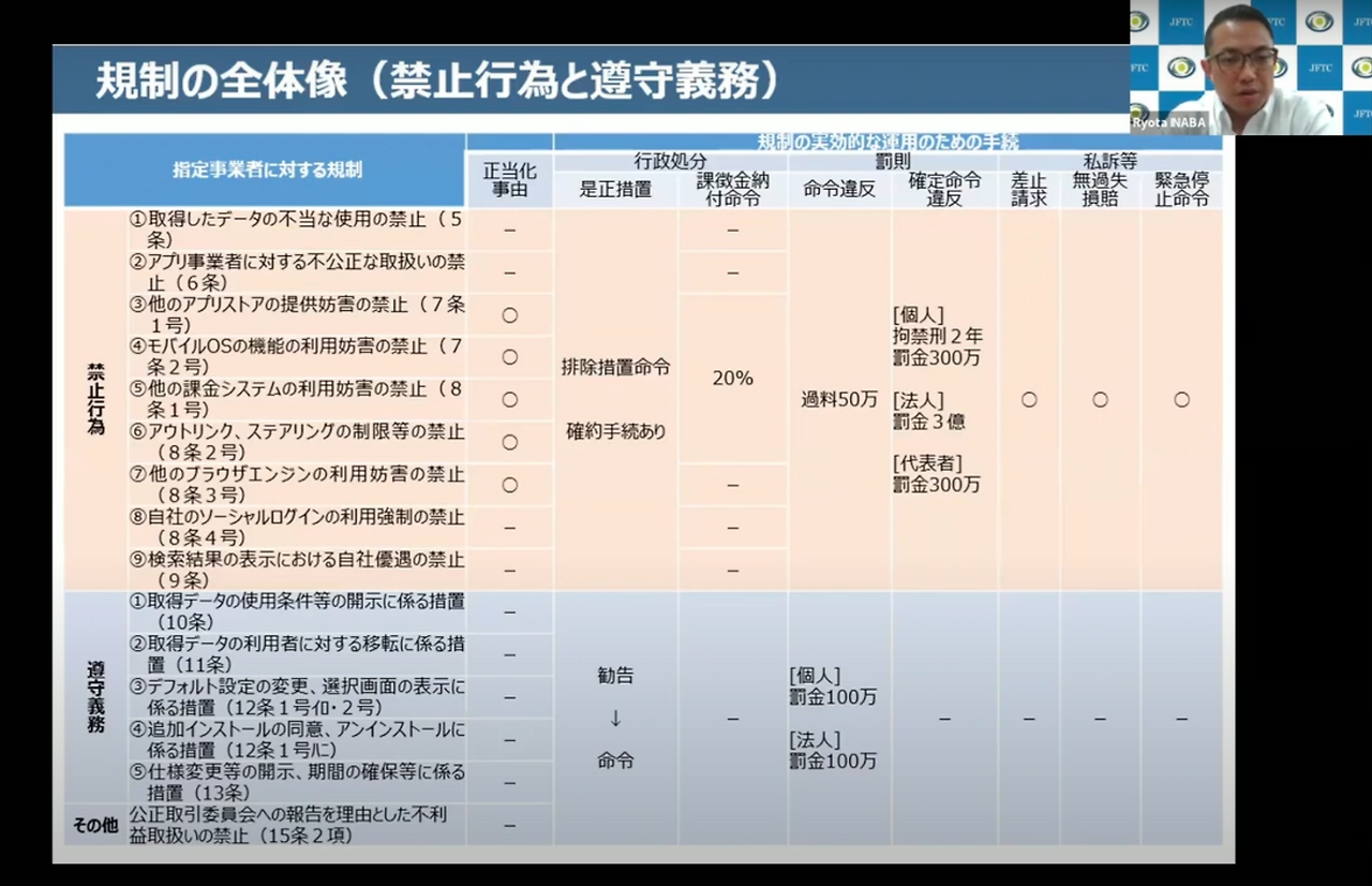 둘째는, 스마트폰법과 플랫폼법의 관계와 관련된 부분으로, 제13조 관련하여 동조는, 마치 플랫폼법처럼, 지정 사업자가 OS, 앱스토어, 브라우저 관련 사양 변경 등에 관하여 이용 사업자들이 그러한 변경에 대응할 수 있도록 미리 미리 정확한 정보를 공개할 의무를 규정하고 있다. 이나바 료타는 앱스토어에 관해서는 분명 둘 간에 중첩이 있음을 인정하면서 규제 중복이 이뤄지지 않도록 Apple에 대해서는 스마트폰법으로 일원화하여 규제할 것으로 예상된다고 설명한다(39:40 지점). 두 기관 간에 어떤 식으로 조정이 이뤄진 것인지는 잘 모르겠지만(법에서 관련 규정을 찾지는 못했다) 흥미로운 지점으로 알아 두면 좋겠다고 생각하였다.
